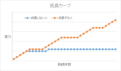 特徴として、最初の数年は誰でも成長します。これは会社の仕事に慣れる期間です。問題はその後です。成長が止まる人と成長を続ける人の差がグラフのように現れます。