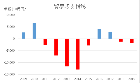 過去10年間の日本の貿易収支状況は赤字です。石油や生活用品をイメージしてもらえばよいかと思いますが、海外製品に依存しています。