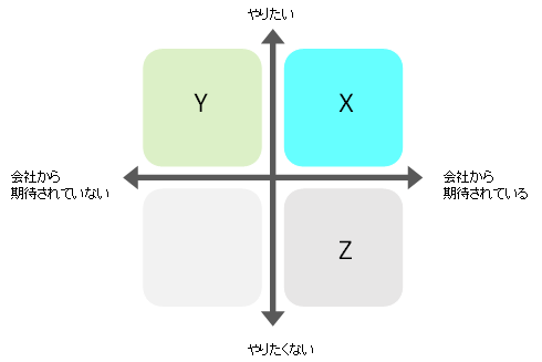 次にもう一つ図で表したいと思います。 「会社に求められていること」と「やりたいこと」を二つの軸で表現した図になります。