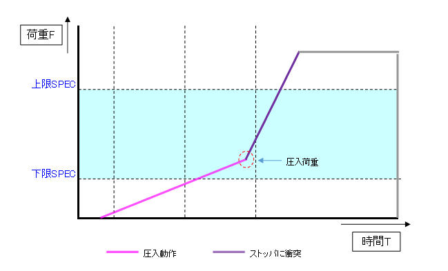 この紺色の開始荷重(圧入動作が終了してストッパにあたった荷重)が「圧入荷重」になります。