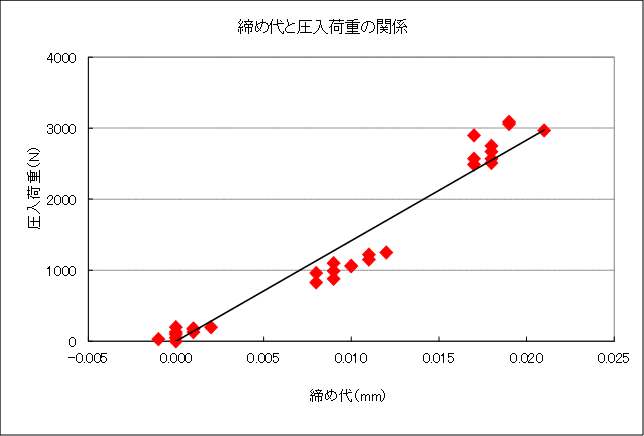圧入荷重は部品締め代(どの程度のはめあいになっているか)に依存します。
