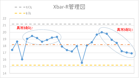 - 異常傾向1:管理限界線(LCL,UCL)を超える
